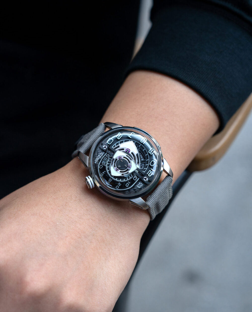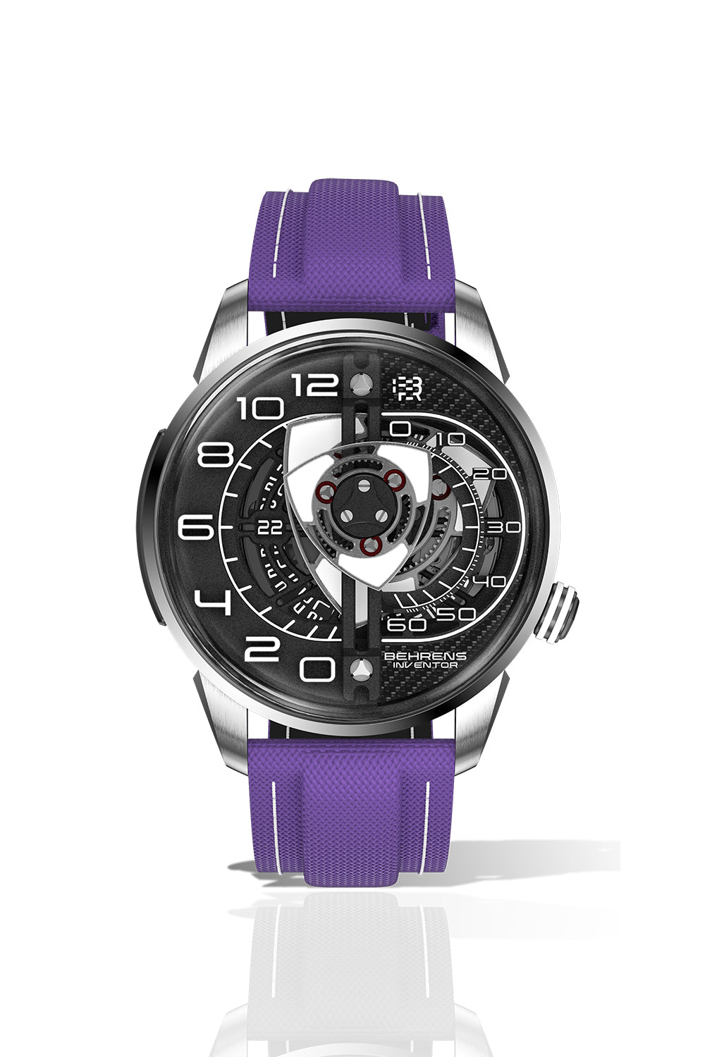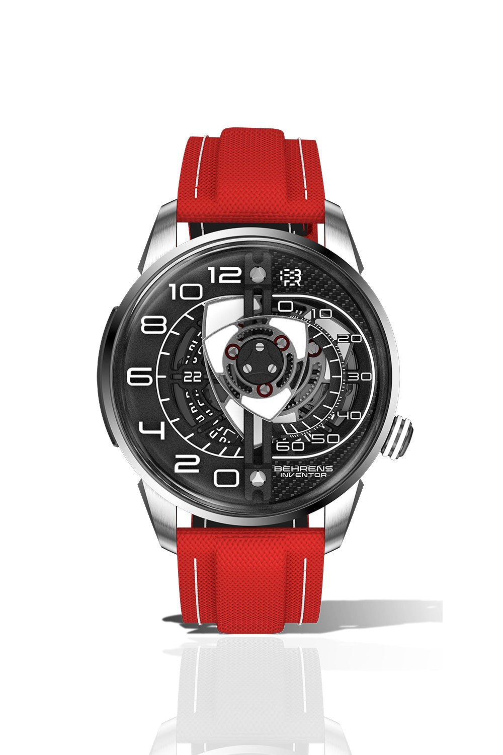 B022 “Rotary” is a mechanical wristwatch which we have constructed base on a “ETA” caliber 2824-2 Swiss automatic movement as a power source. From there, we have designed and constructed a twin-rotary construction module on top which simulate the motion of the iconic Rotary engine. The large rotor with the triangular pointers rotating with a fixed but non-uniformed track at the bottom alongside with the applied metal indexes on the left-hand side of the dial will represent the time in “HOURS”, whereas the smaller triangular 3-pointer rotor on top alongside with the metal applied indexes on the right-hand side of the dial will represent the time in “MINUTES”. (Both rotors are installed with sufficient numbers of rubies for reducing friction and to increase efficiency.)