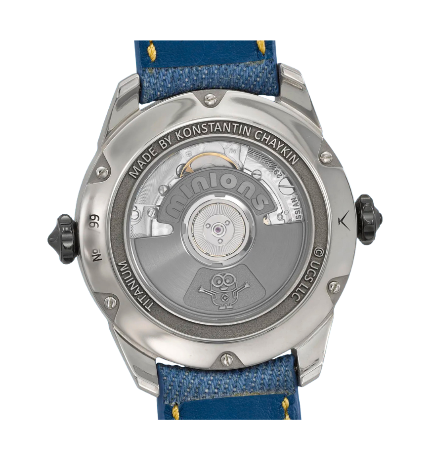 Originally unveiled during Dubai Watch Week 2021, the Minions watch instantly captivated collectors with its whimsical reinterpretation of horology. Konstantin Chaykin reimagined the piece with a titanium case for a refreshed and more contemporary feel. The result: a perfect contrast between the energetic yellow dial and the grey-toned, directionally polished titanium. The caseback reveals a special engraving of the Minions characters, making this not only a timepiece but also a miniature work of mechanical art. It celebrates both imaginative watchmaking and cultural storytelling.
