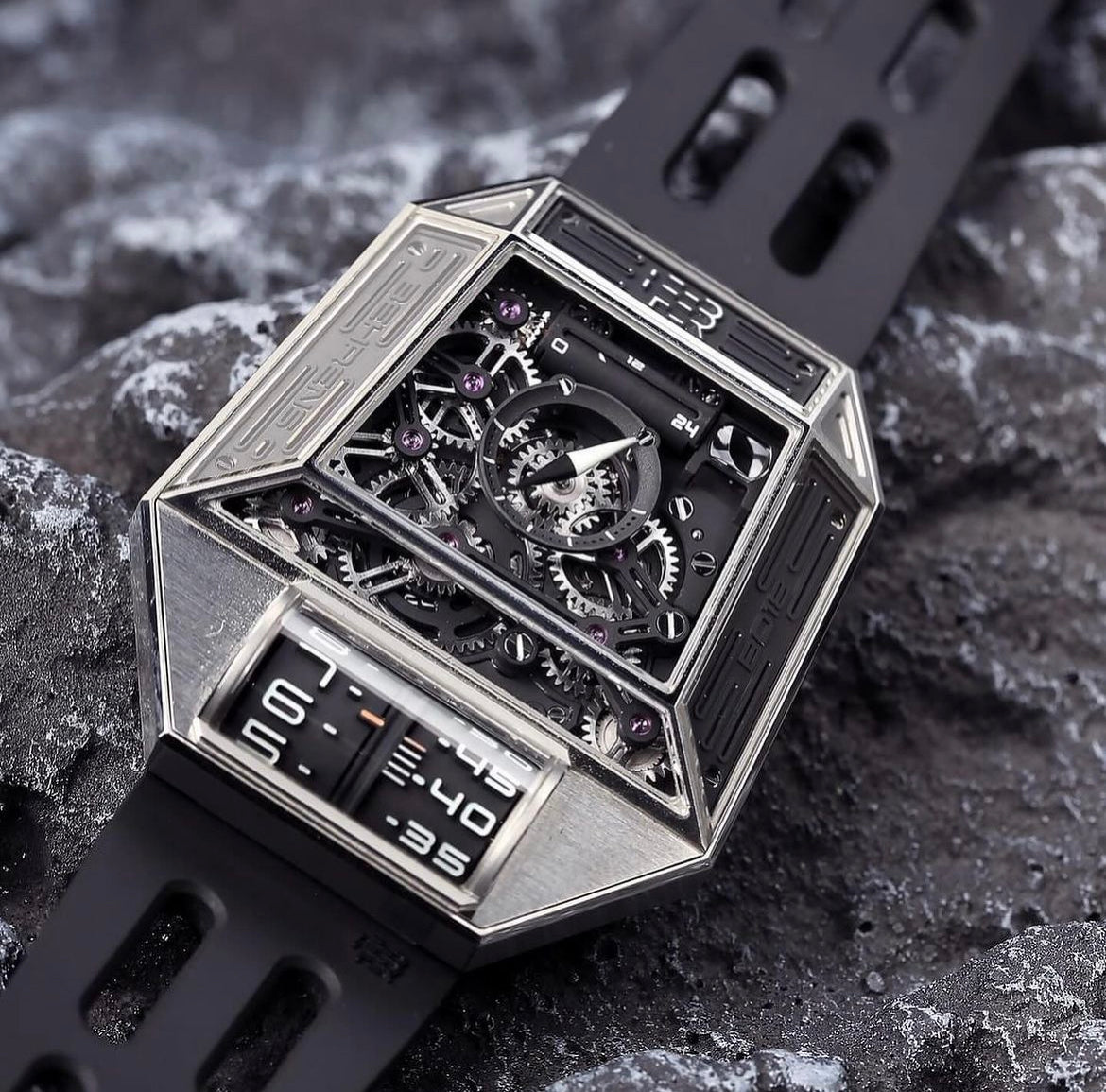 "Orion One" integrates several original patents, including a patented lever type winding/time setting mechanism, and a strap quick-release system. The watch's movement has been meticulously reconstructed, comprising over 30 components to reproduce BEHRENS' classic "time display on a circular axis" concept. Additional features include a linear type 24-hour (Day/Night) display, a date function with a magnifying glass for enhanced legibility, and a fluoroelastomer quick-release strap for durability and comfort.